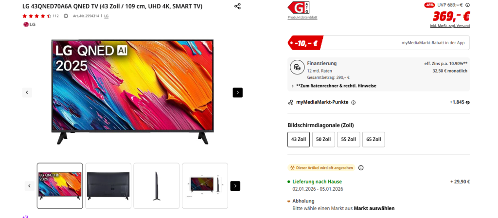 Besonders attraktiv ist der aktuelle Preisnachlass bei MediaMarkt. Die unverbindliche Preisempfehlung des LG QNED-TVs lag ursprünglich bei rund 689 Euro. Aktuell wird das Modell für etwa 369 Euro angeboten, was einer Ersparnis von rund 46 Prozent entspricht. Auch die größere 55-Zoll-Version ist deutlich reduziert. Der Versand ist kostenfrei, was den Deal zusätzlich aufwertet.