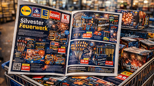 In den Märkten stehen vor allem Feuerwerksartikel der Marke Comet im Fokus, darunter Batterien, Raketen-Sortimente und Misch-Sets. Gleichzeitig erinnert Netto an die Abgaberegeln: Artikel der Kategorie F2 werden ausschließlich an Personen ab 18 Jahren verkauft. Jugendfeuerwerk ist im Prospekt separat gekennzeichnet und wird ab 12 Jahren ausgewiesen.
