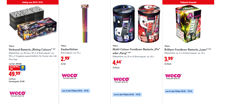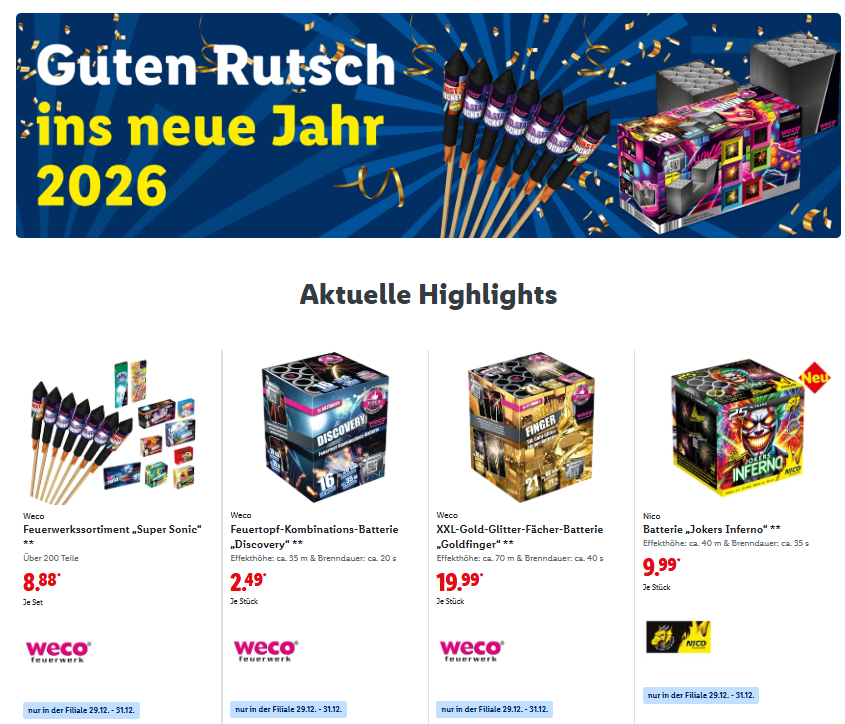 Preislich sind Discounter besonders attraktiv. Einzelraketen kosten meist zwischen 1,50 und 3 Euro. Kleine Batterien liegen häufig bei 8 bis 15 Euro. Größere Familien-Sets bewegen sich im Bereich von 20 bis 35 Euro. Das Angebot ist jedoch begrenzt, weshalb viele Artikel schnell ausverkauft sind.