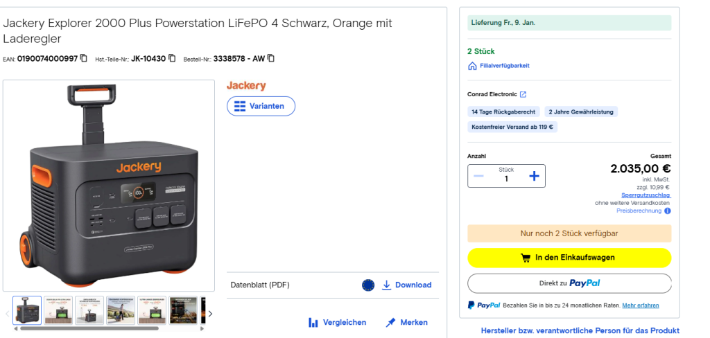 Für den deutschen Markt liegt der Preis der Jackery Explorer 2000 Plus aktuell bei rund 2.035 Euro. Damit positioniert sich das Modell klar im Premium-Segment. Angesichts der gebotenen Leistung, Kapazität und der Testergebnisse sehen viele Experten das Preis-Leistungs-Verhältnis dennoch als angemessen. Im Jahr 2026 dürfte die Powerstation vor allem für Haushalte interessant bleiben, die gezielt in Notstromvorsorge investieren wollen. Auch im Vergleich zu klassischen Generatoren bietet sie klare Vorteile.