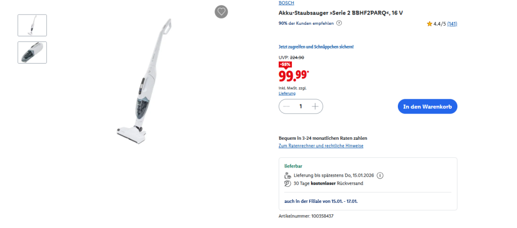 Besonders auffällig ist der Preis, den Lidl für den Bosch Akku-Staubsauger aufruft. Statt eines ursprünglichen Verkaufspreises von über 200 Euro liegt der aktuelle Angebotspreis bei rund 99,99 Euro. Damit spart man mehr als die Hälfte gegenüber der unverbindlichen Preisempfehlung. Für Deutschland 2026 gehört dieses Angebot zu den günstigsten für ein Markenprodukt dieser Kategorie. Lediglich Versandkosten können beim Onlinekauf hinzukommen.